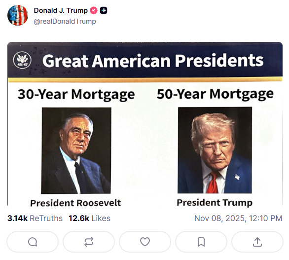 Speaking of bad bets, my 𝕏 feed blew up Sunday with people chattering about 50 year mortgages after Trump floated the notion on Truth Social with an image comparing himself to FDR. I’m not a finance guy, but I think a 50 year mortgage is probably not a good idea. I know I’m not alone, but I’d rather be alone than in the company of arguments that don’t even show a grasp of the subject matter.